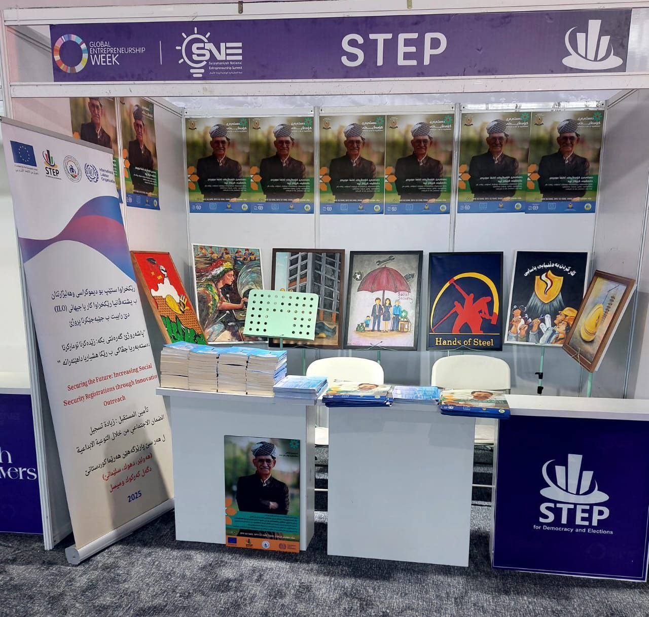 Activity 7: Participation in the National Entrepreneurship Summit in Sulaymaniyah: This activity targeted entrepreneurs and small and medium-sized enterprise (SME) owners. A dedicated booth was set up to present and distribute awareness materials. The activity also included a workshop featuring presentations from: Workers’ Union, Social Security Directorate, STEP Organization for Democracy and Elections